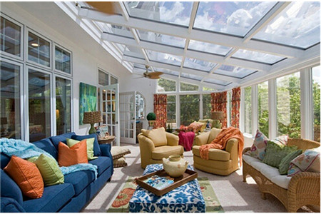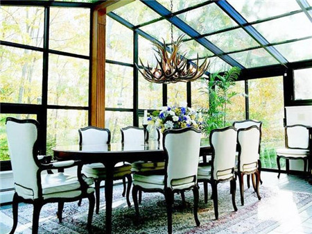 陽光房裝修設(shè)計方案4、如果是需要傳統(tǒng)建筑功能(如:特色客廳、書房、活動室等)的陽光房,宜選擇鋼化中空玻璃屋頂,并配有適量專用中空玻璃天窗,以斷橋鋁中空玻璃窗或鋁木復(fù)合中空玻璃窗作周邊維護的產(chǎn)品。在使用時還需配備專用遮陽簾、遮陽棚、隱形紗窗等產(chǎn)品。如果追求最新時尚且預(yù)算充裕的話,可挑選最新高科技的調(diào)光玻璃作為陽光房的玻璃,可遙控調(diào)節(jié)玻璃的透明與不透明,綠色節(jié)能的同時,完全保護隱私。