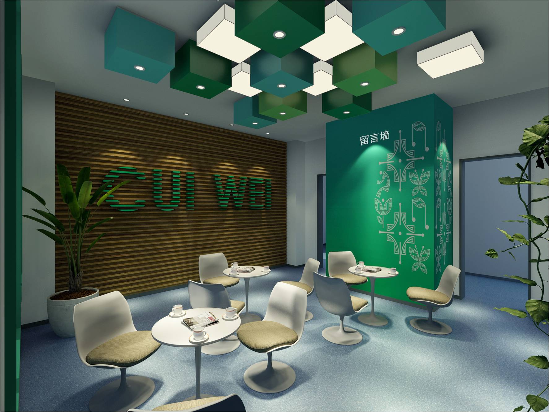 入口結(jié)合學(xué)校輔助圖形綠色墻面與翠微賦的結(jié)合及辦學(xué)特色的墻面設(shè)計(jì)直接將參觀者置于濃濃的文化氛圍中展示了教育的品牌特色。地面不同顏色的色帶將空間功能分布簡單明了的說明給參觀人員。