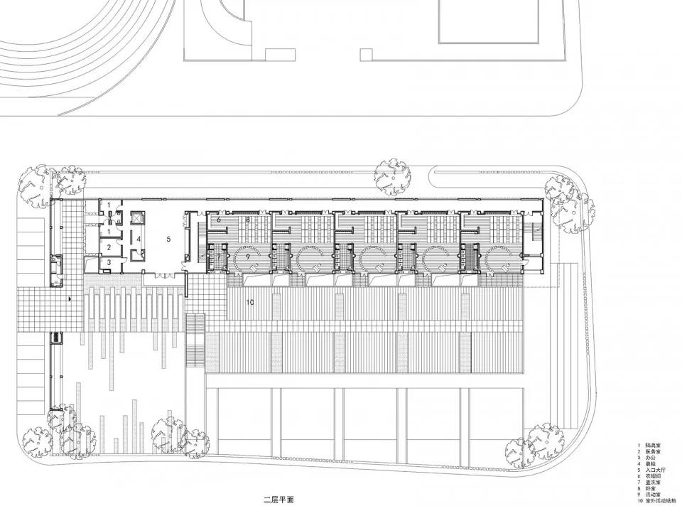 建筑中間的內(nèi)院使一層北側(cè)行政和服務(wù)空間也可得到足夠的采光。在景觀方面,每個班級都有對應(yīng)的綠地供幼兒活動。