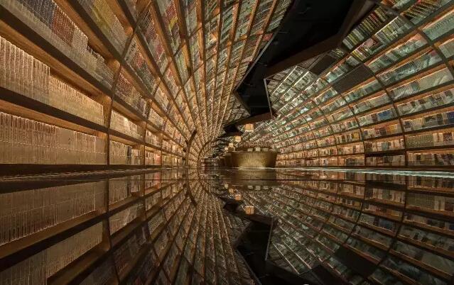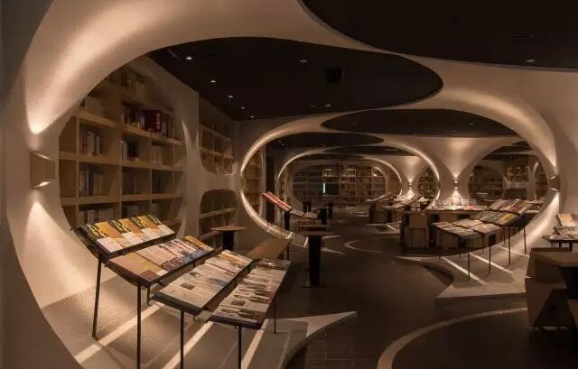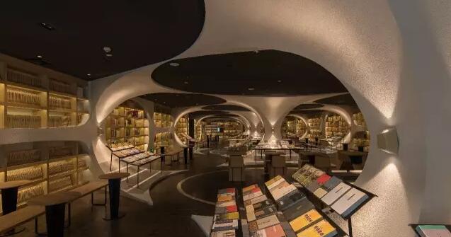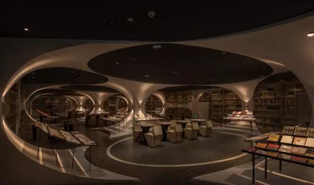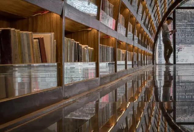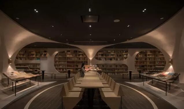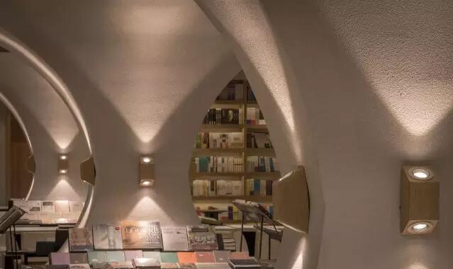 走入揚州鐘書閣的正門則是書店的前廳通廊,設(shè)計師利用揚州本地拱橋的概念,巧妙地延續(xù)了鐘書閣書天書地的視覺符號。在地面與天空中的河流鏗鏘前行中,引領(lǐng)著讀者沉入到浩瀚的知識海洋。兩廂的書架用優(yōu)美的弧線結(jié)構(gòu)拉伸成天際線的形狀,宛如溪流之上的橋梁,搭建著人與書籍之間的那座心靈橋梁。進(jìn)而前行至右側(cè)則是更加廣闊的書籍之地,拱橋及河流的關(guān)系給了設(shè)計師無窮的靈感,于是得到此處的上下鏡像的空間關(guān)系。設(shè)計師還利用各種拱形來連接各個區(qū)域,每一位讀者進(jìn)入這個空間,就能充分感受到這空間帶來的震撼。鏡像、拱形加上柔和的燈光,這一切所帶來的迷離感,會讓讀者不由自主地想起橋下的波光粼粼,悄然靜思中達(dá)到心情的平和,并享受讀書的快樂。由各種波起伏連接而成的空間,保留了足夠的尺度,以便留給給讀書分享會的讀者分享的場地。