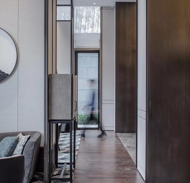 推門進(jìn)入,首先步入眼簾的是前廳。淺木色木質(zhì)格柵自上而下充斥整個(gè)8米層高空間,建筑元素織就的前廳展現(xiàn)了自然的親切和溫暖,加之兩側(cè)與頂燈的渲染,與外部形成了視覺上的差異,令人震撼。肅然進(jìn)入,行至位于對(duì)立面凹檻處的接待臺(tái),半遮掩狀態(tài)的圓形導(dǎo)臺(tái)被裹挾式藏以身后,僅以灰色墻紙和深色大理石裝飾,藏而不露更添幾分神秘。