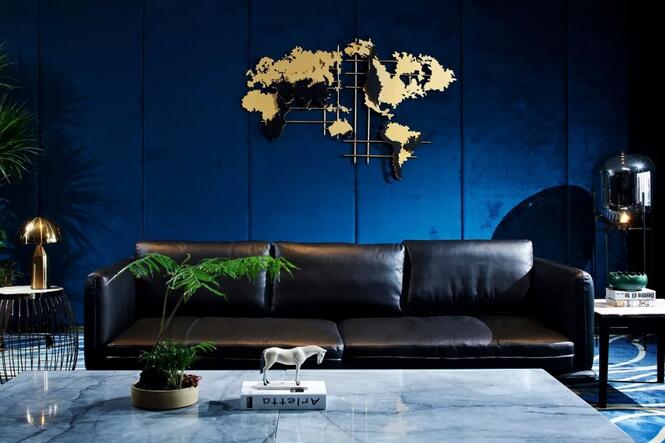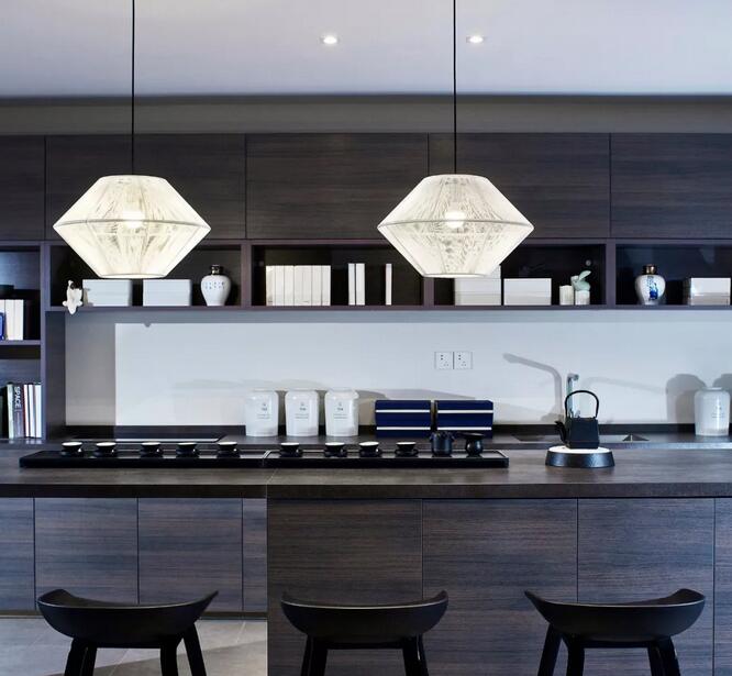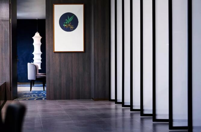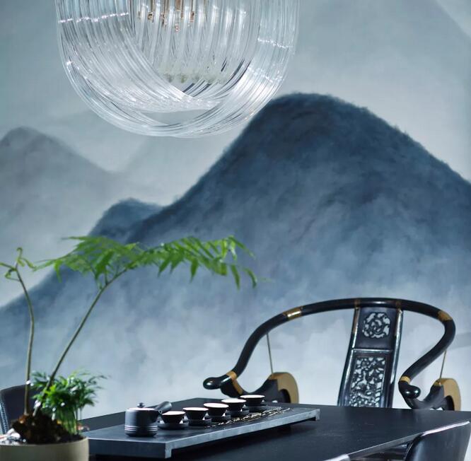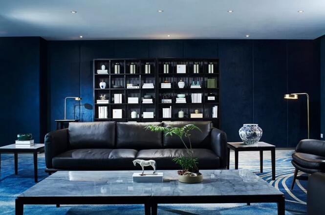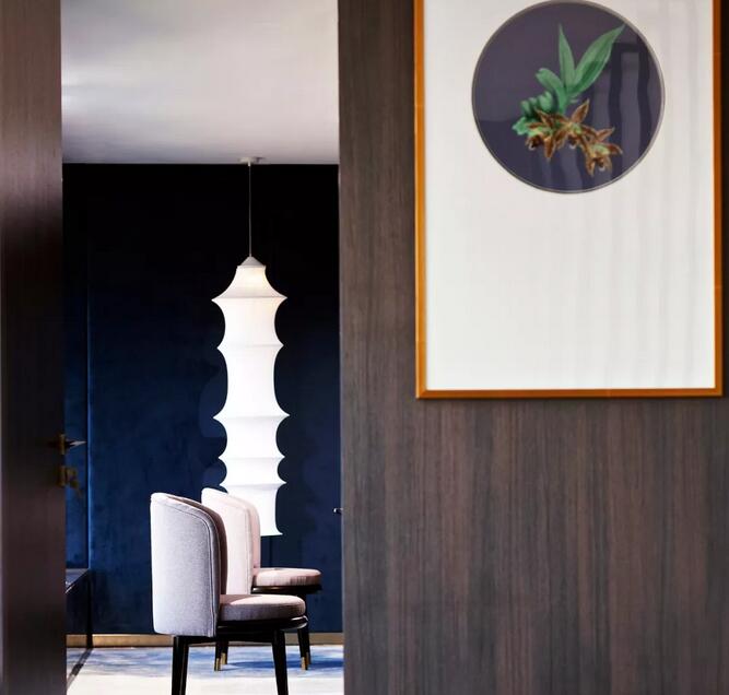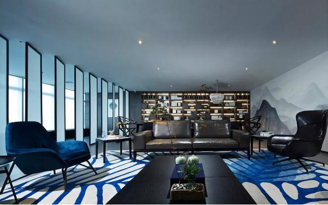 中式元素跟摩登的這種碰撞很奇妙,你可能會(huì)覺(jué)得這兩個(gè)風(fēng)格不想(相)干,但是在兩位設(shè)計(jì)師看來(lái)卻是十分和諧。簡(jiǎn)潔大氣的設(shè)計(jì)框架中點(diǎn)綴中國(guó)古典山水之意蘊(yùn)。休閑區(qū)沙發(fā)上的藍(lán)色絲絨,仿佛也是空間故事的起承轉(zhuǎn)合。