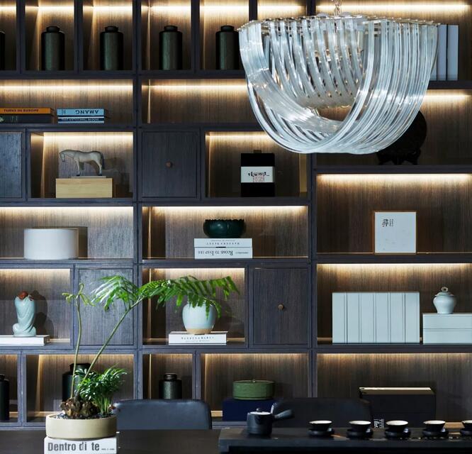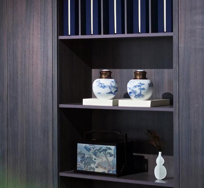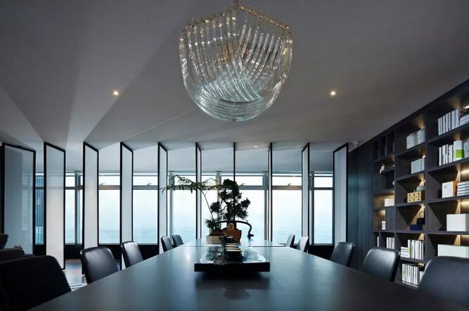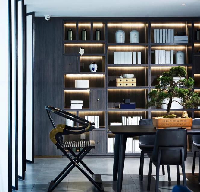 休閑區(qū)內(nèi),一株松柏透出骨子里濃濃的文人趣味,屏風(fēng)之后又是海納百川的廣闊胸懷??臻g中的新中式書(shū)架以及皮質(zhì)沙發(fā)通常服務(wù)于成功男性,設(shè)計(jì)師將傳統(tǒng)交椅的小尺度改為大比例,為舒適加分,觀賞海景的同時(shí)帶來(lái)君臨天下的會(huì)談體驗(yàn)。