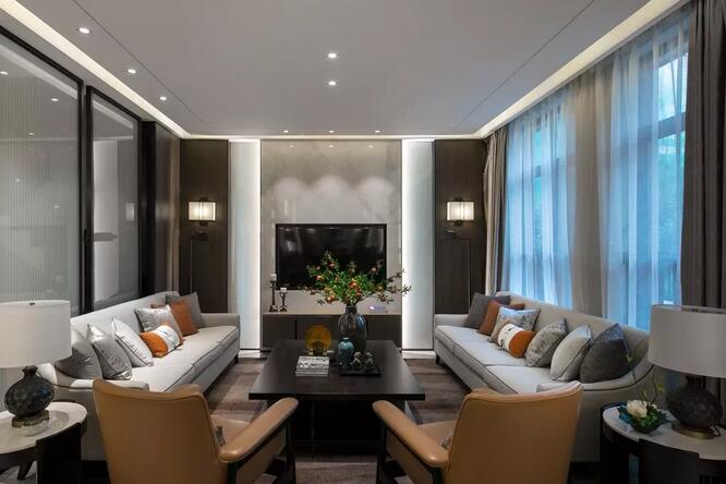 空間以優(yōu)雅與低調(diào)的材質(zhì)為主,軟裝材料以有質(zhì)感的棉麻搭配帶有山水元素的絲光布,家具主要以深木飾面為主。