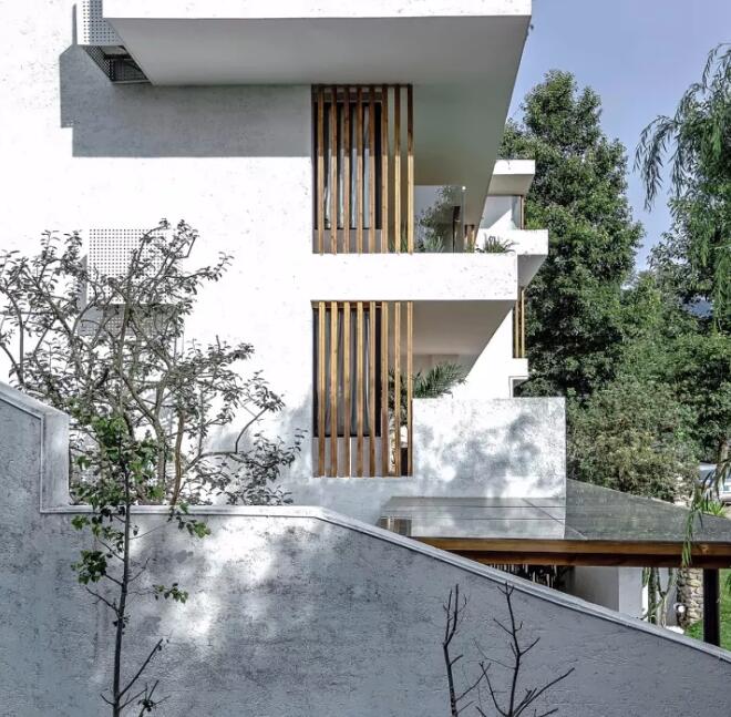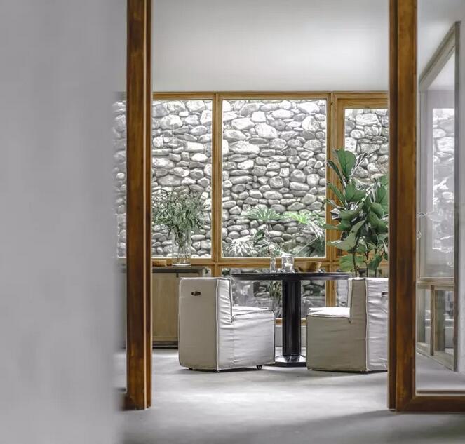 拾山房在材料的運用上也秉持著低調的特點。主體是略帶粗糲的清水混凝土,配以木格柵和木質的窗框,頂層則是以木為主,與自然更為相融。首層院落則有山石堆砌的圍墻,從坡地里長出。整體用色也非??酥?,在這山水之中絲毫不顯突兀。