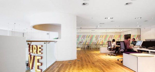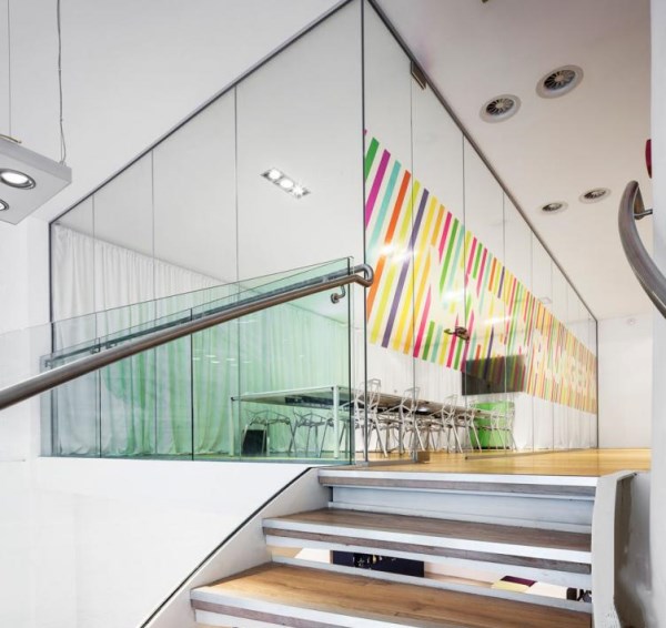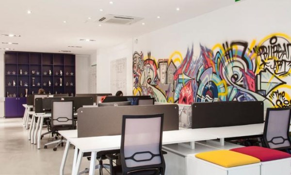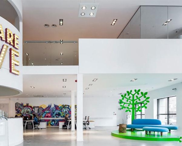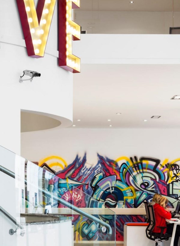 該辦公空間展示出了無(wú)限的創(chuàng)造力,從接待處旁邊看,懸掛在彎曲的臺(tái)階墻上的“我們都在線”的標(biāo)語(yǔ)到使辦公室變得活躍的涂鴉墻,每個(gè)元素都是精心挑選,可以增強(qiáng)品牌的意識(shí),提升整體的創(chuàng)造力水平。