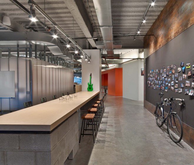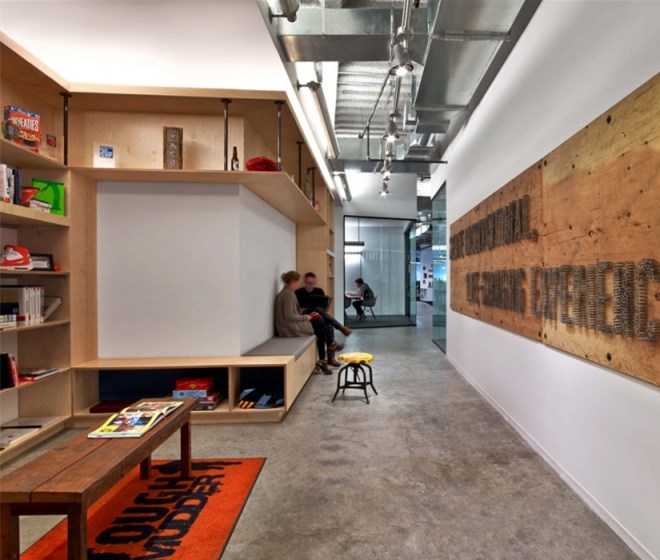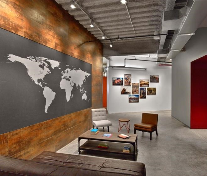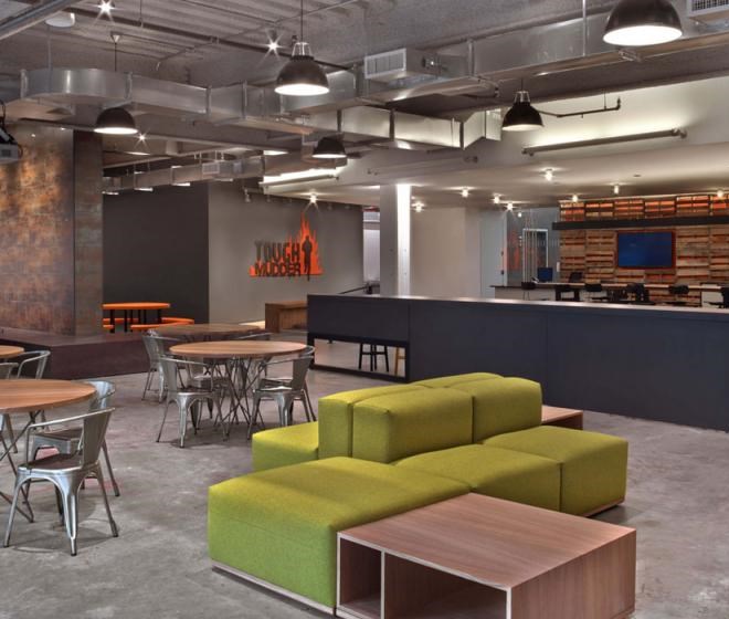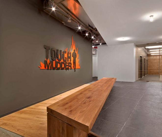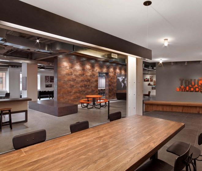 每個(gè)元素看起來都十分隨意,不過卻專業(yè)并且十分友好。從模仿考頓鋼的墻面到重新利用的木頭、印著Tough Mudder標(biāo)志和簽名的水泥煤渣磚會(huì)議桌。該設(shè)計(jì)提供了一個(gè)現(xiàn)代美感與工業(yè)化魅力結(jié)合的空間。