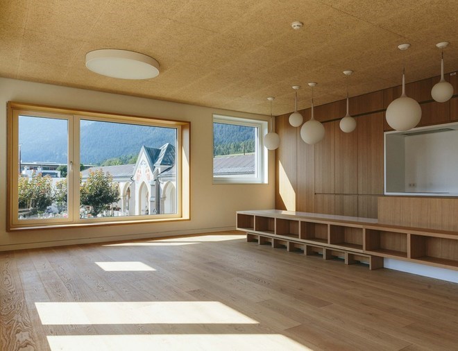 樓梯直接通往公共用餐區(qū),它與八組兒童房間相連組成了一個(gè)巨大的共享空間。孩子在這里學(xué)習(xí)娛樂(lè),所有空間都均質(zhì)排布。建筑師設(shè)計(jì)了大量的被動(dòng)式節(jié)能屋。