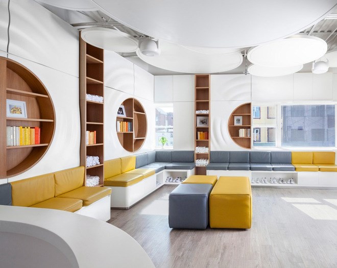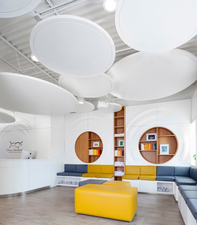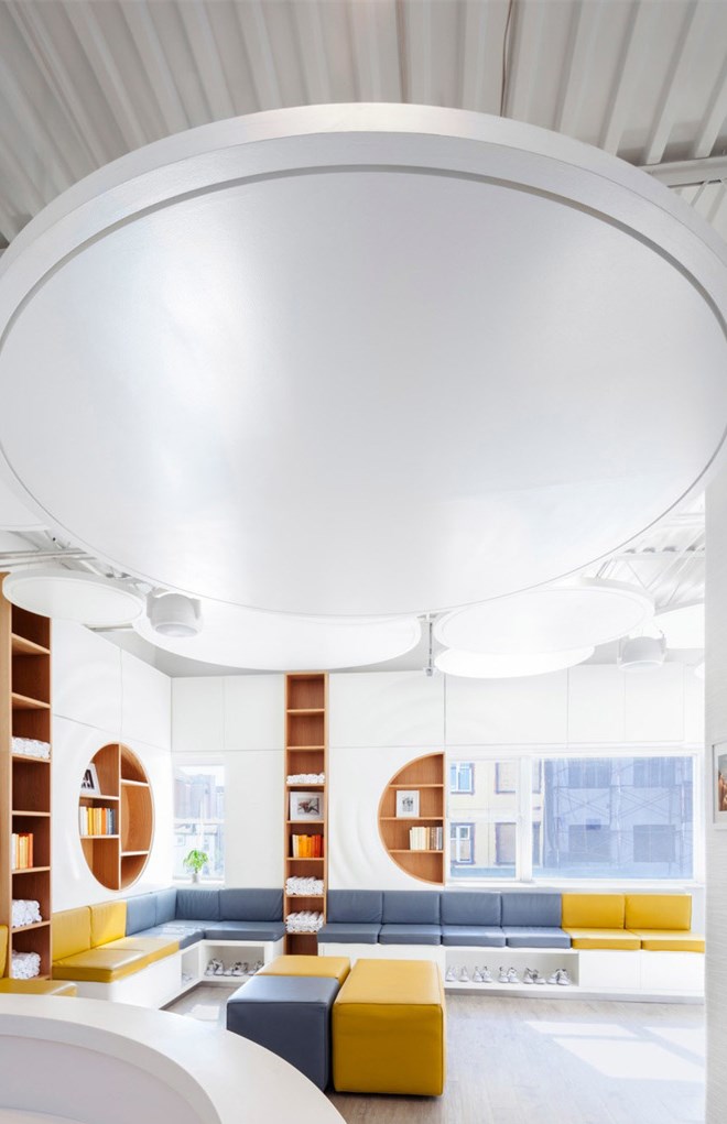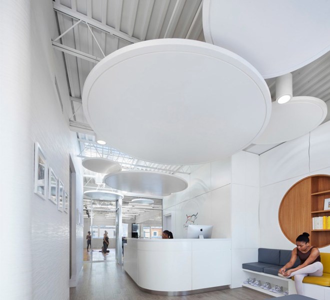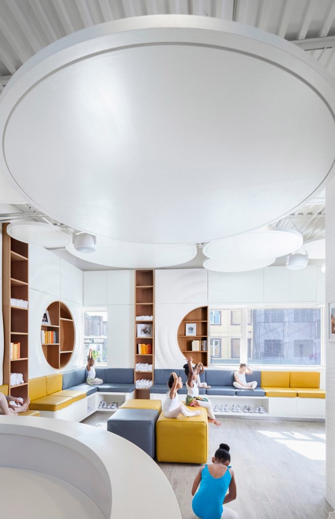 圓形的波紋圖案組成了一個色彩豐富溫馨的圖書室,設有舒適的座椅和社交空間,人們可以安靜地閱讀書籍,做伸展訓練,或是和朋友加深交流。舞蹈教室設有彈簧地板和明亮的天窗,為舞者創(chuàng)造了絕佳的環(huán)境。兩間教室之間采用可變隔墻,在演出時可以將隔斷完全打開,形成一個帶遮光簾的巨大舞臺。