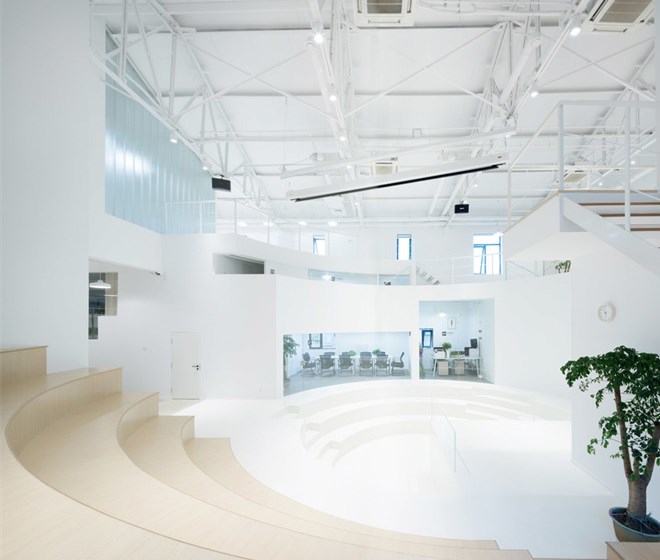 彼岸天總部辦公室位于吉里(北京)國(guó)際藝術(shù)區(qū),其成名作中國(guó)動(dòng)畫(huà)電影《大魚(yú)海棠》2017年于第15屆布達(dá)佩斯國(guó)際動(dòng)畫(huà)電影節(jié)斬獲最佳動(dòng)畫(huà)片。吉里(北京)國(guó)際藝術(shù)區(qū)內(nèi)聚集了各類影視產(chǎn)業(yè)企業(yè),大魚(yú)海棠的新辦公空間選定在9米層高的一座老廠房?jī)?nèi)。新空間保留了老廠房的屋架和外立面的圍護(hù)結(jié)構(gòu),在保持老廠房記憶的同時(shí),重新設(shè)計(jì)了部分辦公空間的外墻,以及全部門窗和基礎(chǔ),植入新的鋼結(jié)構(gòu)進(jìn)行功能體塊分割,達(dá)到新與舊的共融和碰撞。整個(gè)園區(qū)是灰蒙蒙的老廠房,而新空間外墻選用白色基調(diào)一直延伸到室內(nèi),搭配部分木材質(zhì)感,給予通透和純凈的感受。