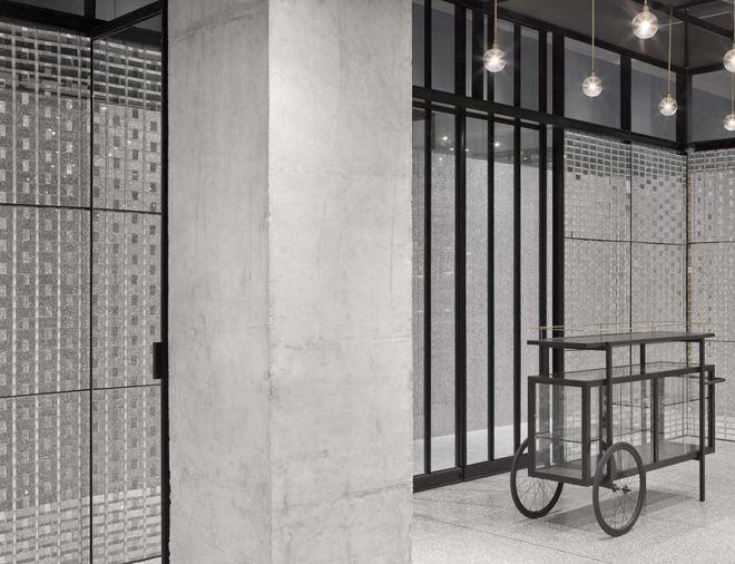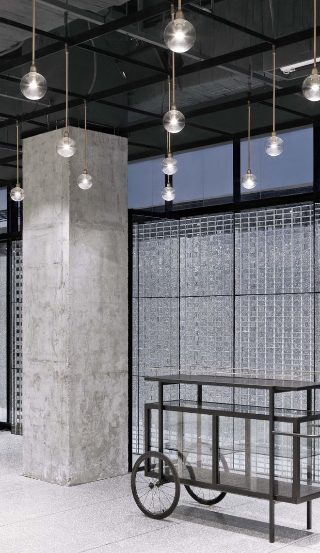 室內(nèi)擺放了定制的家具,例如以街邊攤販的推車為靈感而特別設(shè)計(jì)的移動(dòng)式餐車。定制的燈泡以矩陣形式懸掛排列,呈現(xiàn)出簡單而優(yōu)雅的照明效果,同時(shí)也靈活適用與不同場合對空間的使用需求。