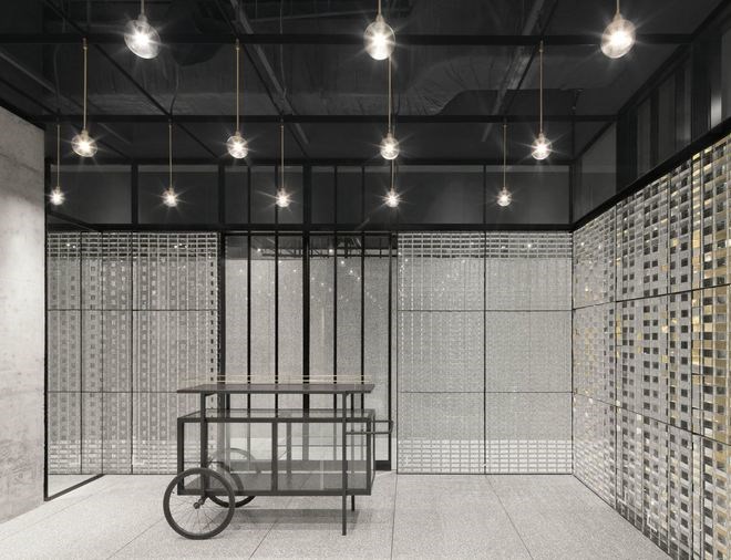 從北京隨處可見的灰色磚砌建筑中汲取靈感,玻璃盒子外殼由壓鑄玻璃磚按照傳統(tǒng)方法搭建制成。精心拼接后形成垂直的墻面系統(tǒng)。透明的墻面最大程度地將自然光引入空間內(nèi)部,帶來明亮而模糊的視野,從一定程度上保護(hù)了空間的私密性。