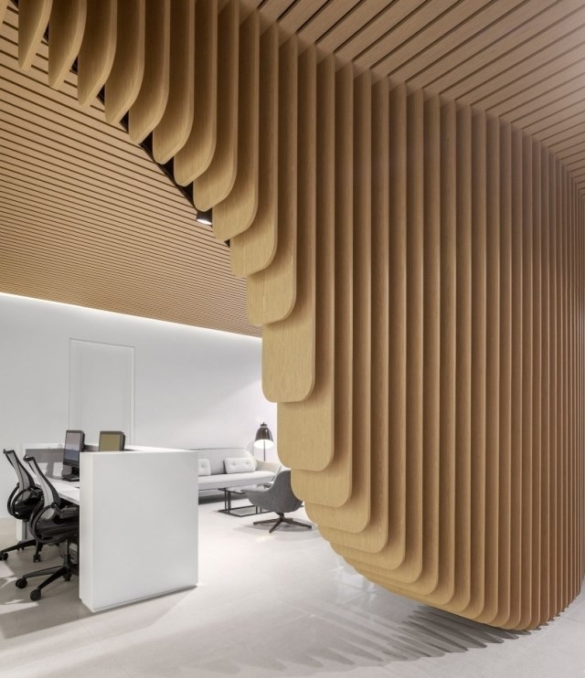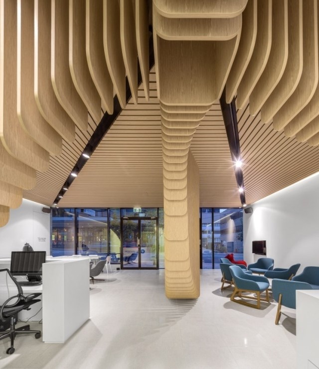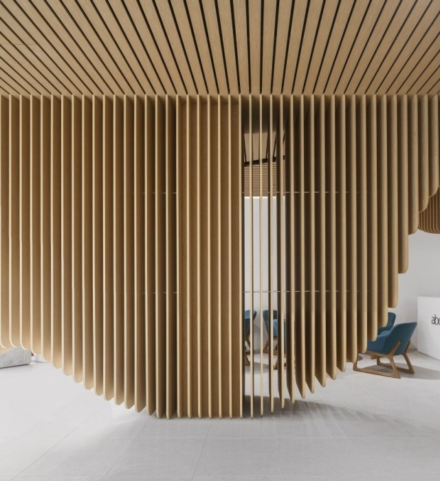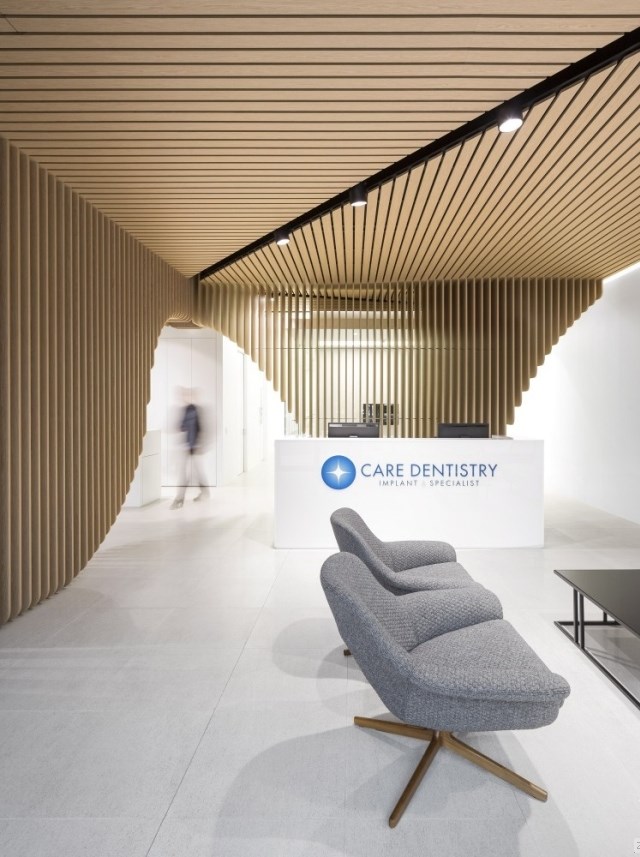 同時,不能讓室內(nèi)顯得局促,還不能擋住路人們的視線。為此,我們特意在兩個接待區(qū)之間設(shè)置了一個木制雕塑,作為二者之間的隔斷。在診所的另外一端,是進行高級口腔手術(shù)的手術(shù)室。