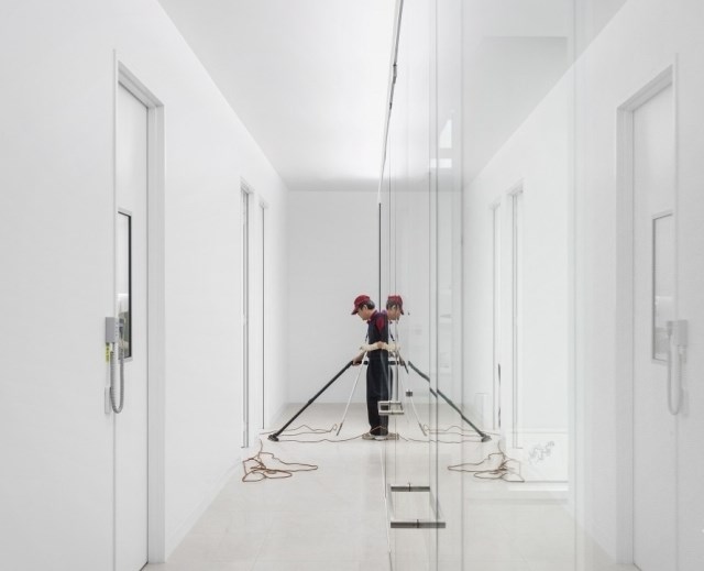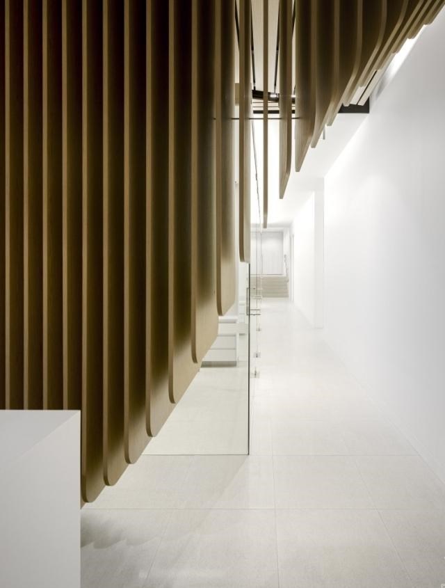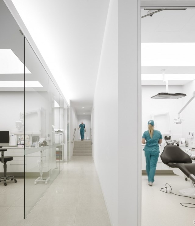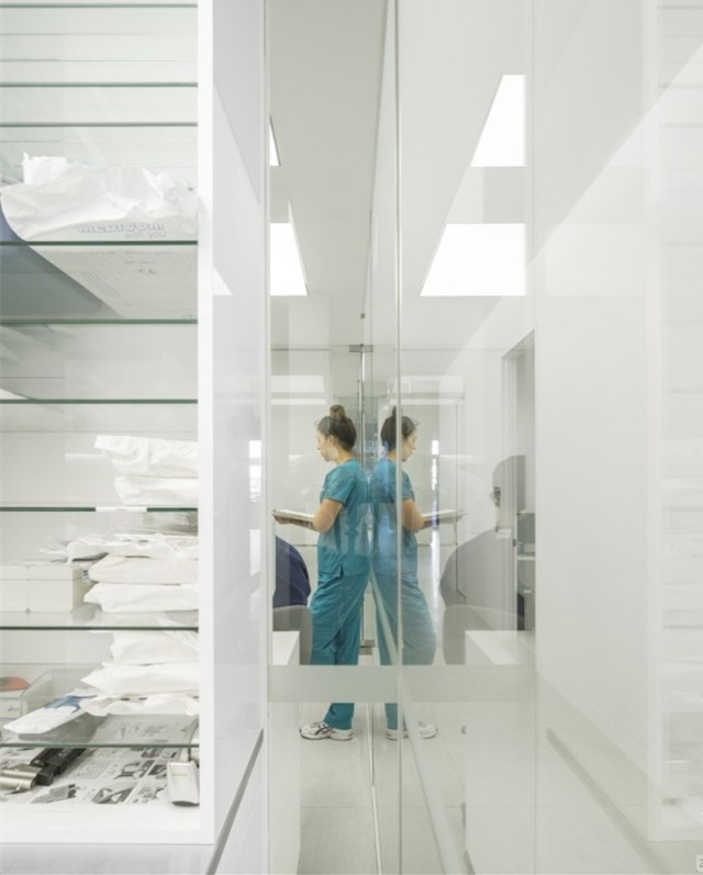診所里其他的區(qū)域都圍繞著中間那條走道排列,這條走道從接待區(qū)那里出發(fā),將整個診所的所有區(qū)域都串在了一起,從檢查區(qū),手術(shù)區(qū),到客戶區(qū)和技術(shù)區(qū)。走道的中間是一個玻璃做成的透明區(qū)域,這是為了讓外面的光線穿透進室內(nèi)來。