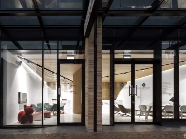 我們應(yīng)邀在悉尼一條銷售高檔產(chǎn)品的商業(yè)街上,設(shè)計一間高端的牙科診所。這是個特殊的項目,因為客戶要求診所擁有分別對應(yīng)的兩個入口和兩個接待區(qū),它們各自的功能完全不同。