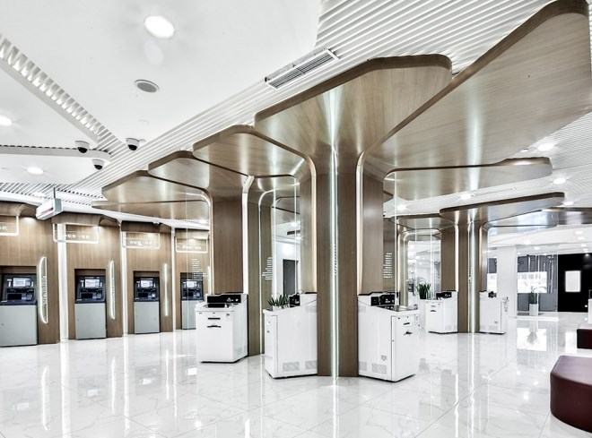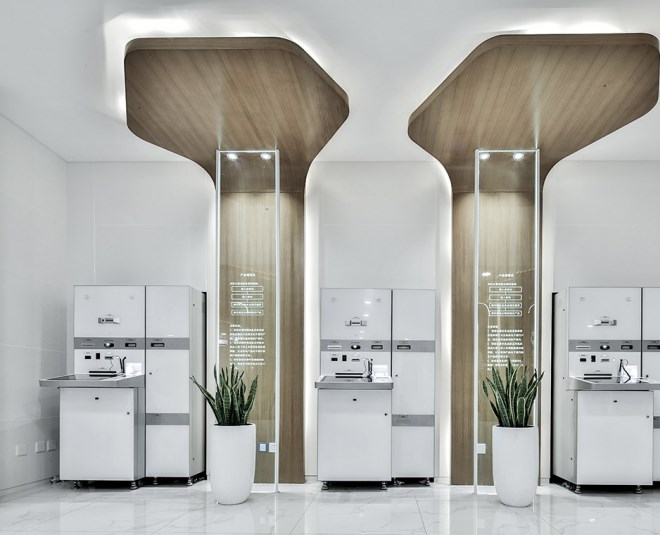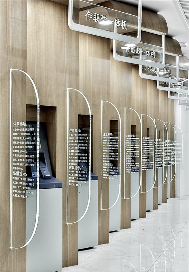 我們?nèi)≈袊ど蹄y行牡丹卡中的牡丹花瓣為元素,用現(xiàn)代手法幾何化再與結(jié)構(gòu)柱結(jié)合,配合木飾面、亞克力等材質(zhì),同時規(guī)避智能機具的碩大體積,使顧客有一個區(qū)別于傳統(tǒng)銀行空間的全新體驗和親和感受。