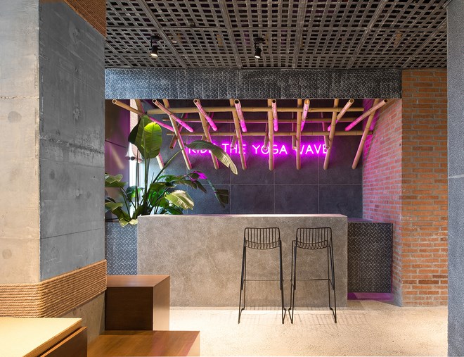 作為主體,不同的房間像是城市中聳立的建筑而公共區(qū)域的空間更像是城市中來(lái)往的街道點(diǎn)綴著城市里的風(fēng)景。在休息室和接待處,設(shè)計(jì)師采用了不規(guī)則的木藝品及榻榻米平臺(tái),提供給客人在瑜珈課之間小憩和靜思的地方。