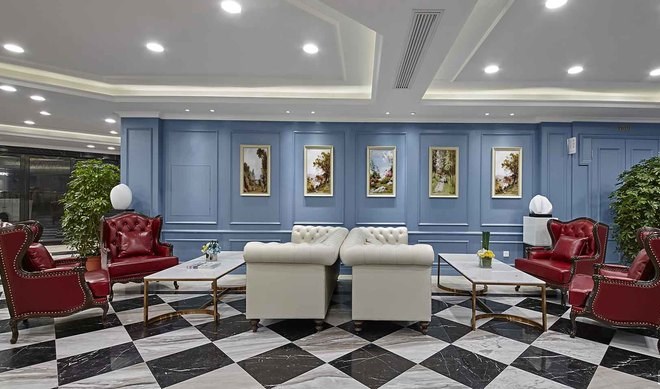 一層強(qiáng)調(diào)英倫的雅致及品位,用淺藍(lán)色歐式墻面穿插整個(gè)空間,強(qiáng)列的空間視角關(guān)系,讓客戶流連忘返,記憶深刻,達(dá)到商業(yè)醫(yī)院經(jīng)營的目的。在本層還很貼心的設(shè)立了兒童娛樂區(qū),在兒童娛樂區(qū)隨處可見的城堡元素、七彩吊燈、搖搖馬等仿佛讓兒童進(jìn)到這里就感覺身處游戲城堡之中,大大緩解了就醫(yī)前的緊張心情。