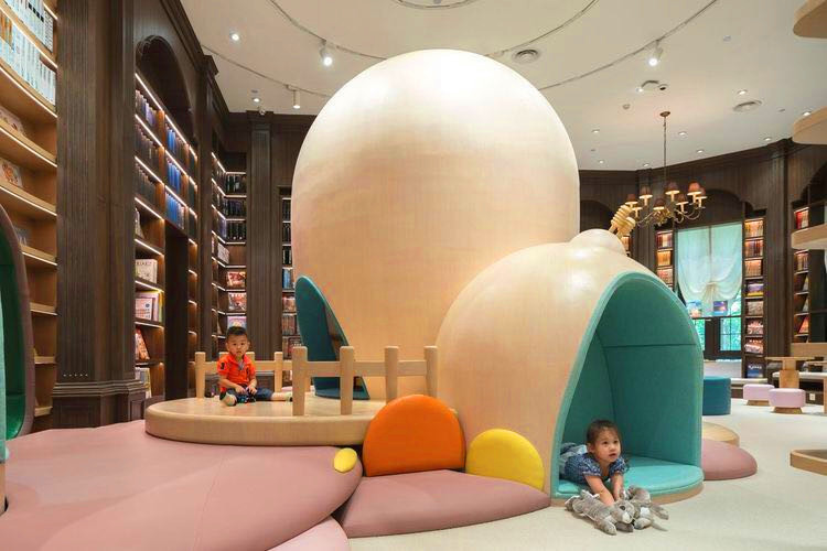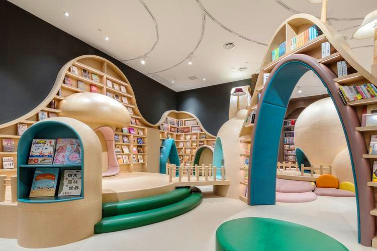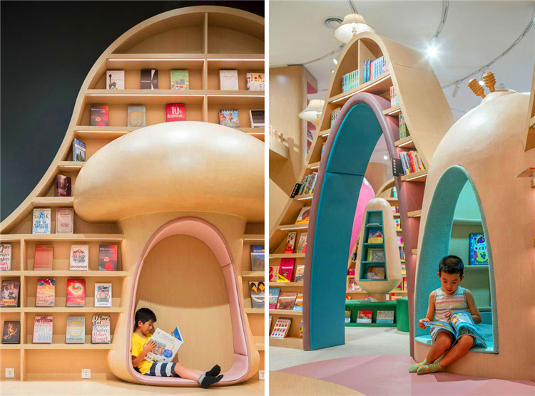 本案設(shè)計思路來源與卡通蘑菇屋,用蘑菇的外形輪廓制作書架以及閱讀區(qū)座位,給孩子們創(chuàng)造生動活剝活波的就讀空間,整個設(shè)計都沒有設(shè)置可移動的家具,在書架邊緣以及就坐區(qū)均采用軟包處理,以保證孩子在自由閱讀時的安全問題。