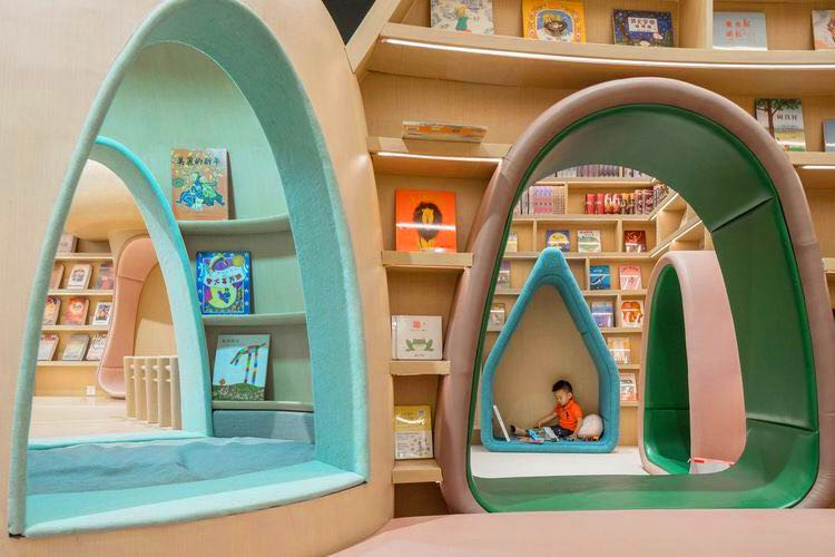 書架與書架之間都可以互通。在這個空間里孩子們充分發(fā)揮想象力,在閱讀的時候可以隨意穿行,隨意在就讀區(qū)閱讀。