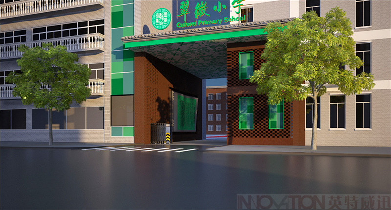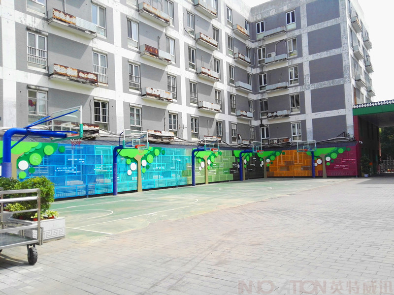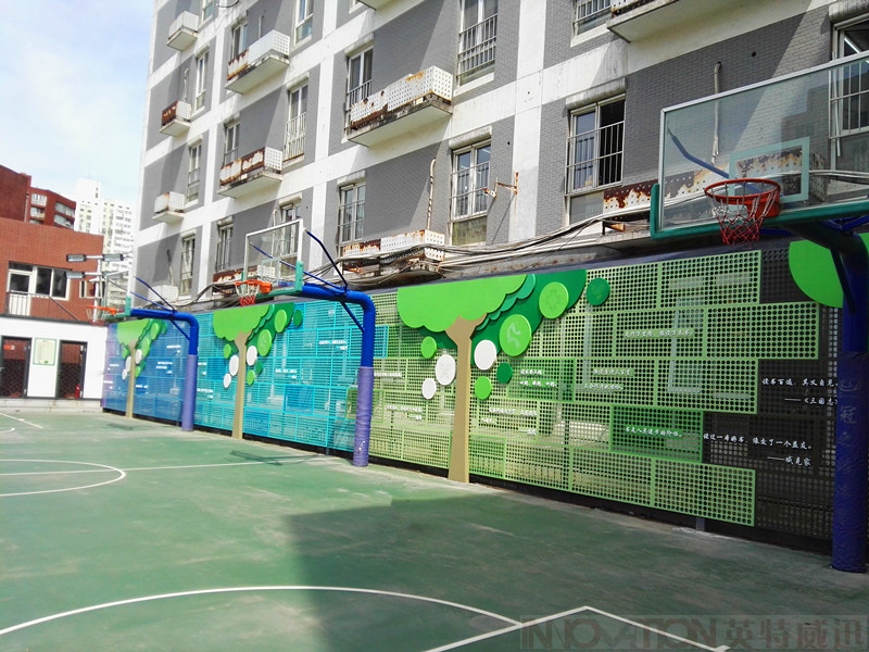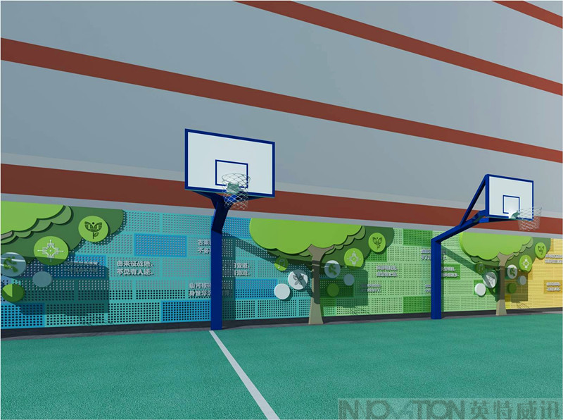 本案采用彩虹七彩顏色、寓意學(xué)生茁壯成長(zhǎng)的小樹(shù)造型與學(xué)校輔助圖形及名人名言相結(jié)合的彩虹墻設(shè)計(jì),既體現(xiàn)學(xué)校教書(shū)育人的宗旨目的,同時(shí)在學(xué)生體育活動(dòng)時(shí)不知不覺(jué)的記住箴言,整體彩虹墻采用穿孔鋼板材質(zhì),兼顧美觀及適用性、安全性,同時(shí)也不遮擋隔壁建筑的采光。